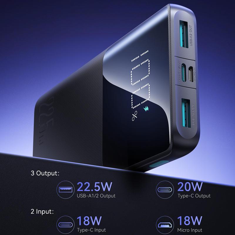 - Multi-Device Charging: Equipped with three output ports, including dual USB-A and Type-C, allowing you to charge up to three devices simultaneously.