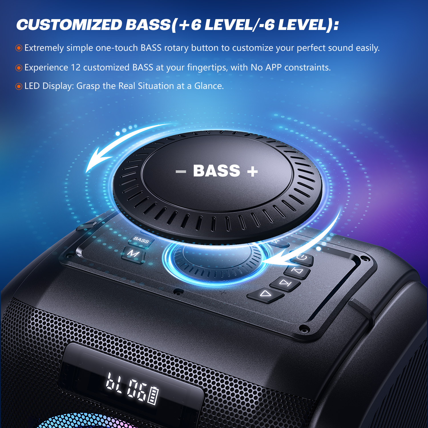 Enjoy full control over your sound with 12 custom bass levels. Easily switch to bass mode with a single click or fine-tune the EQ settings for your microphone and music using the intuitive rotation panel. The digital display keeps you informed with clear indicators for volume, bass, playback mode, and battery life, offering a seamless experience for all age groups.