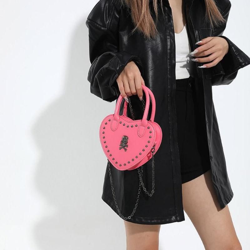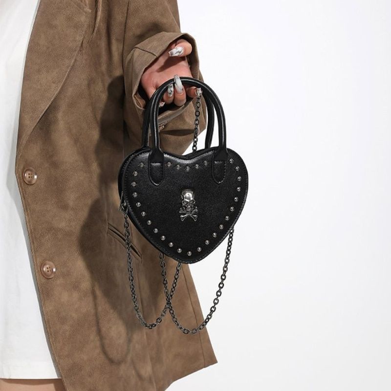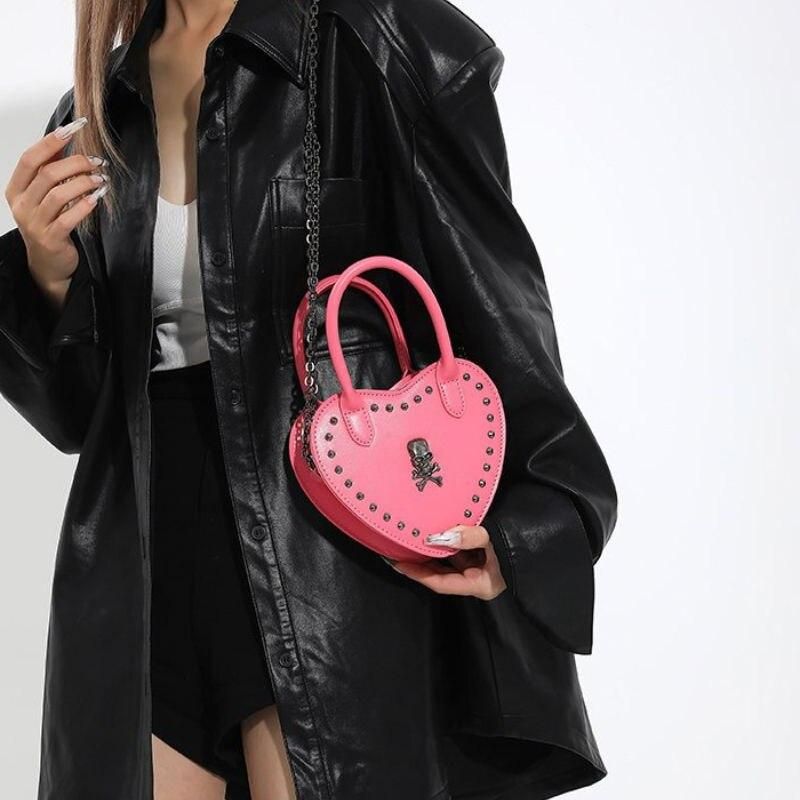 Step into a world where fashion meets rebellion with our Heart-Shaped Y2K Punk Skull Crossbody Bag. Crafted for those who dare to stand out, this bag blends the essence of gothic charm with hip-hop vibes, making it a perfect accessory for any statement-maker. With its unique heart shape, exquisite skull applique, and bold rivet detailing, this bag is not just an accessory but a declaration of style.