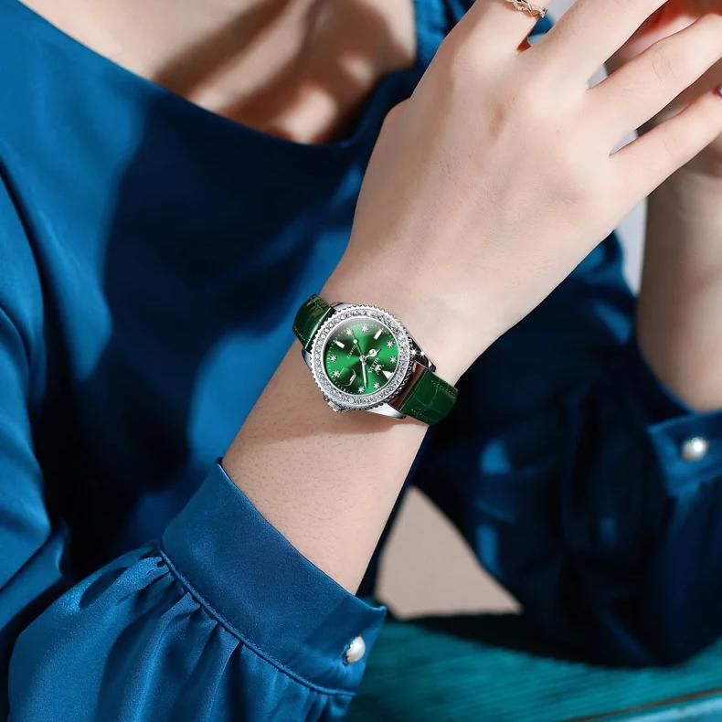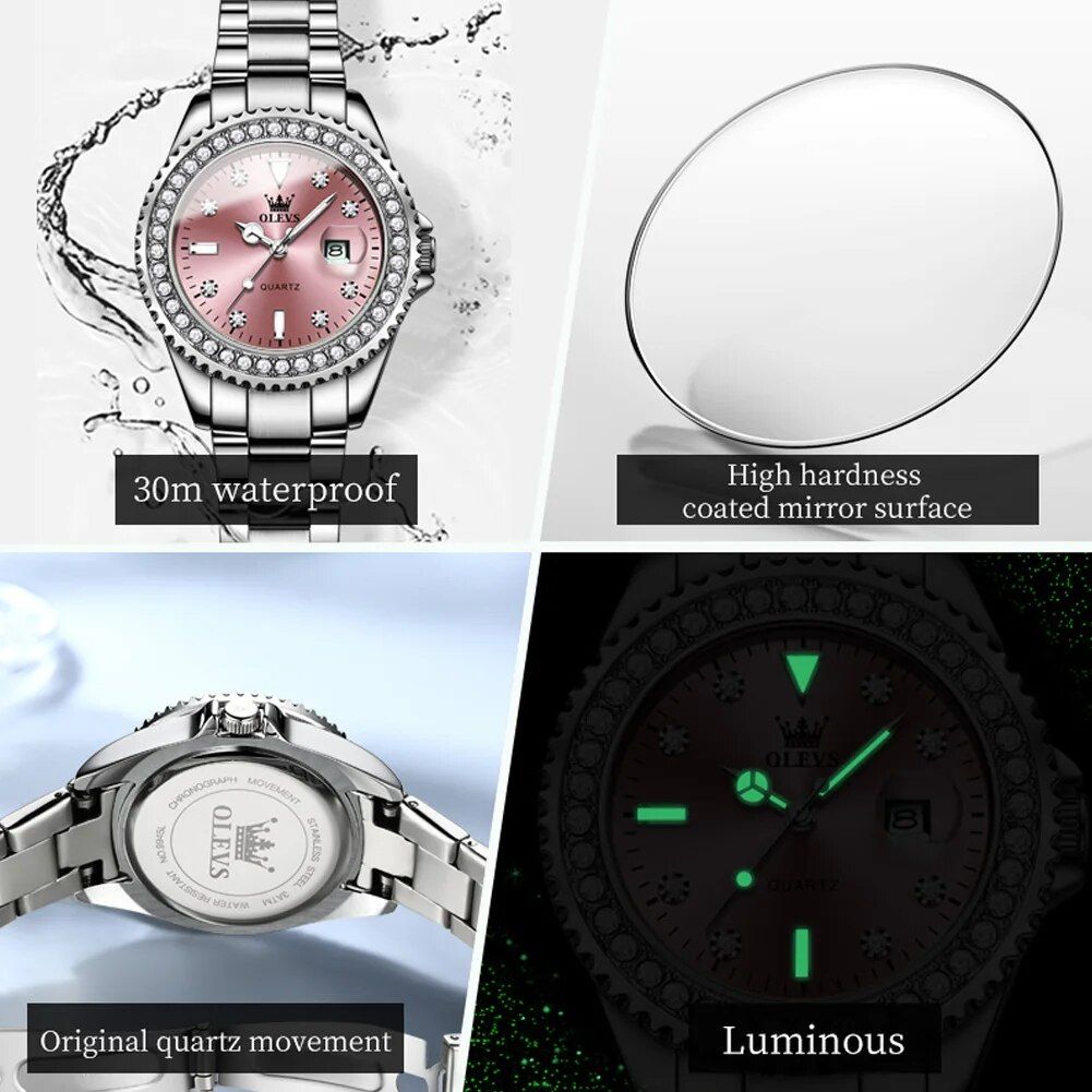 This watch is not just an accessory; it’s a statement of luxury and reliability. The combination of the charming rhinestone dial, luminous hands, and the sleek stainless steel band makes it uniquely versatile for any occasion. Whether you’re attending a formal event or simply going about your day, this watch ensures you do so with elegance and punctuality.