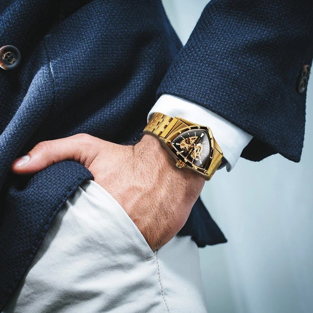 Elevate your style with this uniquely designed Luxury Triangle Skeleton Gold Black Automatic Mechanical Men’s Watch. A perfect blend of elegance and modern technology, this timepiece is designed to stand out in any crowd. Crafted with precision, it embodies the essence of sophistication and is a statement piece for any occasion.