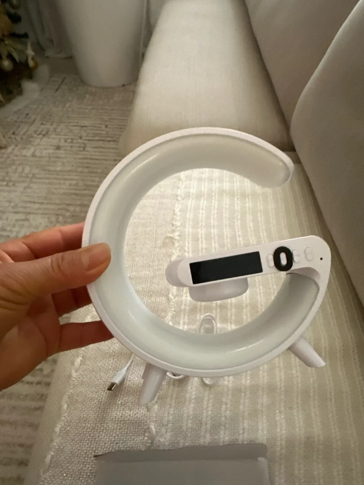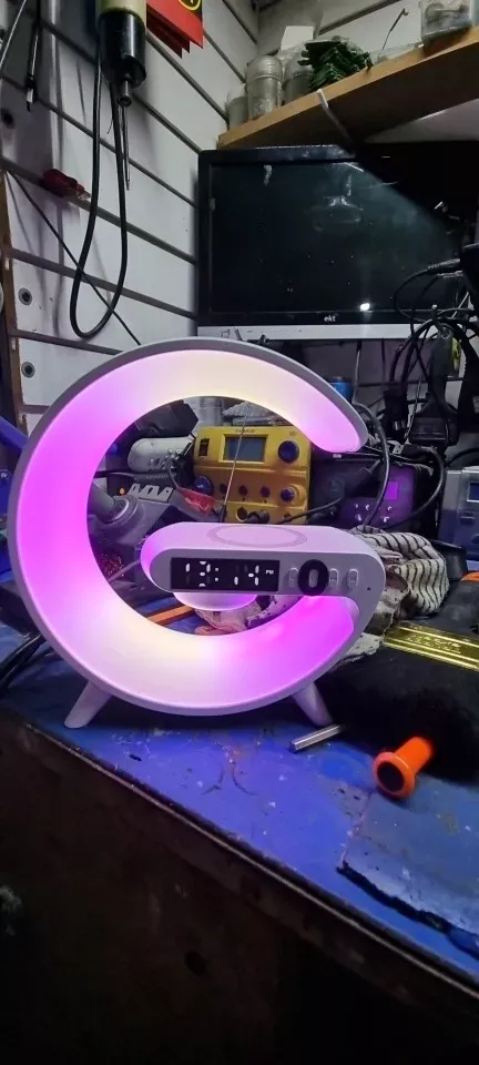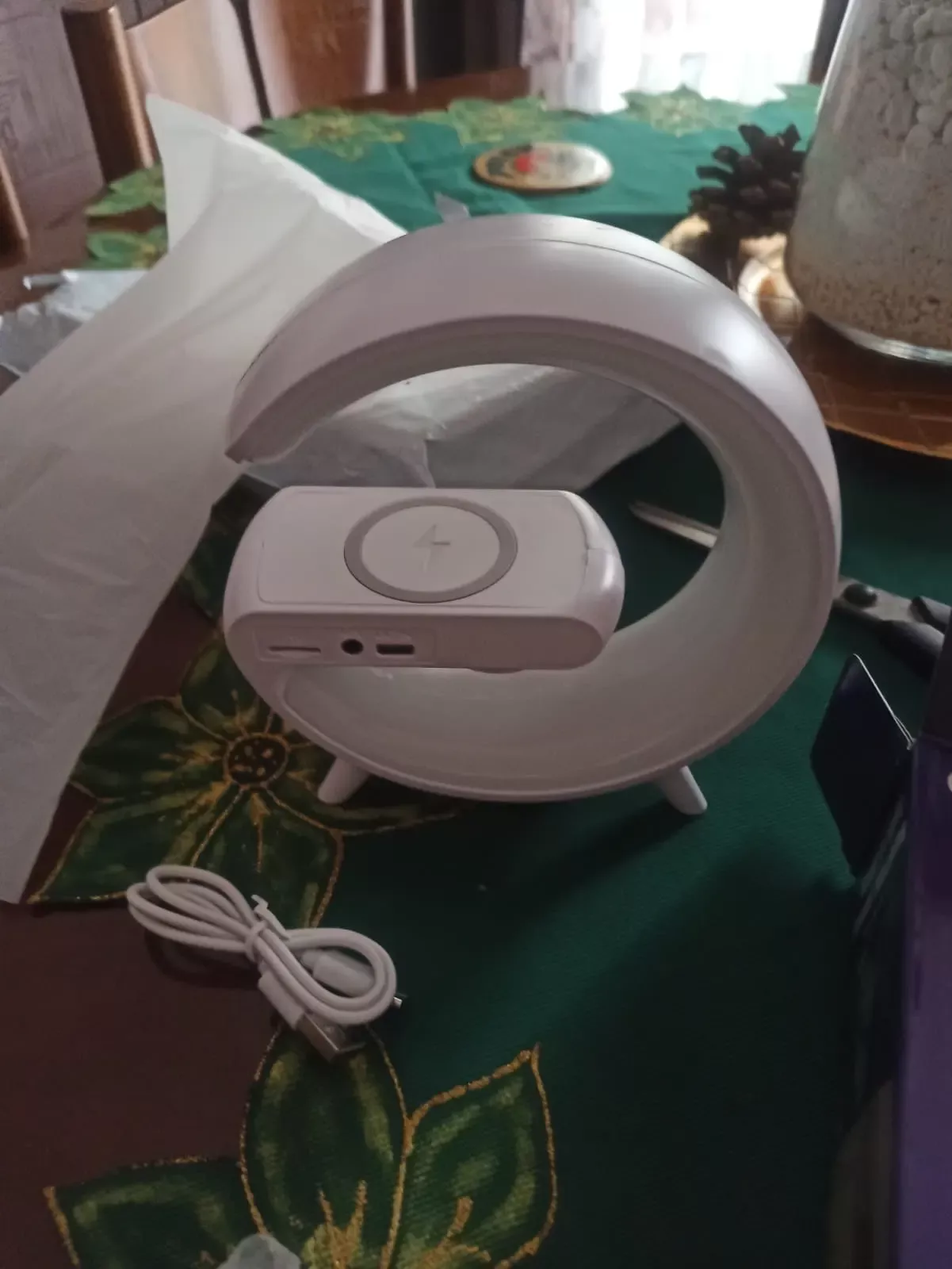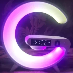 This smart lamp came with a plug and cable. It includes a wireless charger and an alarm, with multicolored lights. The brightness level is adjustable. The night-time lighting creates a great atmosphere. Overall, it’s a really nice product.