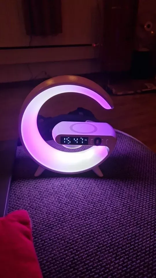 This night light comes with a wireless charging feature. The lighting is stunning, creating a strong atmosphere and the light appears very warm. Charging by the bedside is super convenient. You can adjust multiple lighting modes with just a button press. The wireless charging and Bluetooth speaker are very useful.