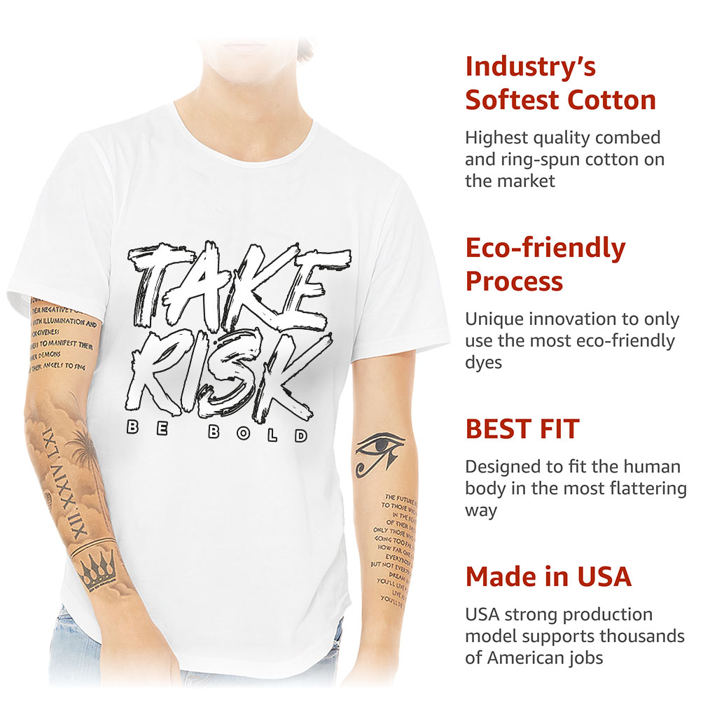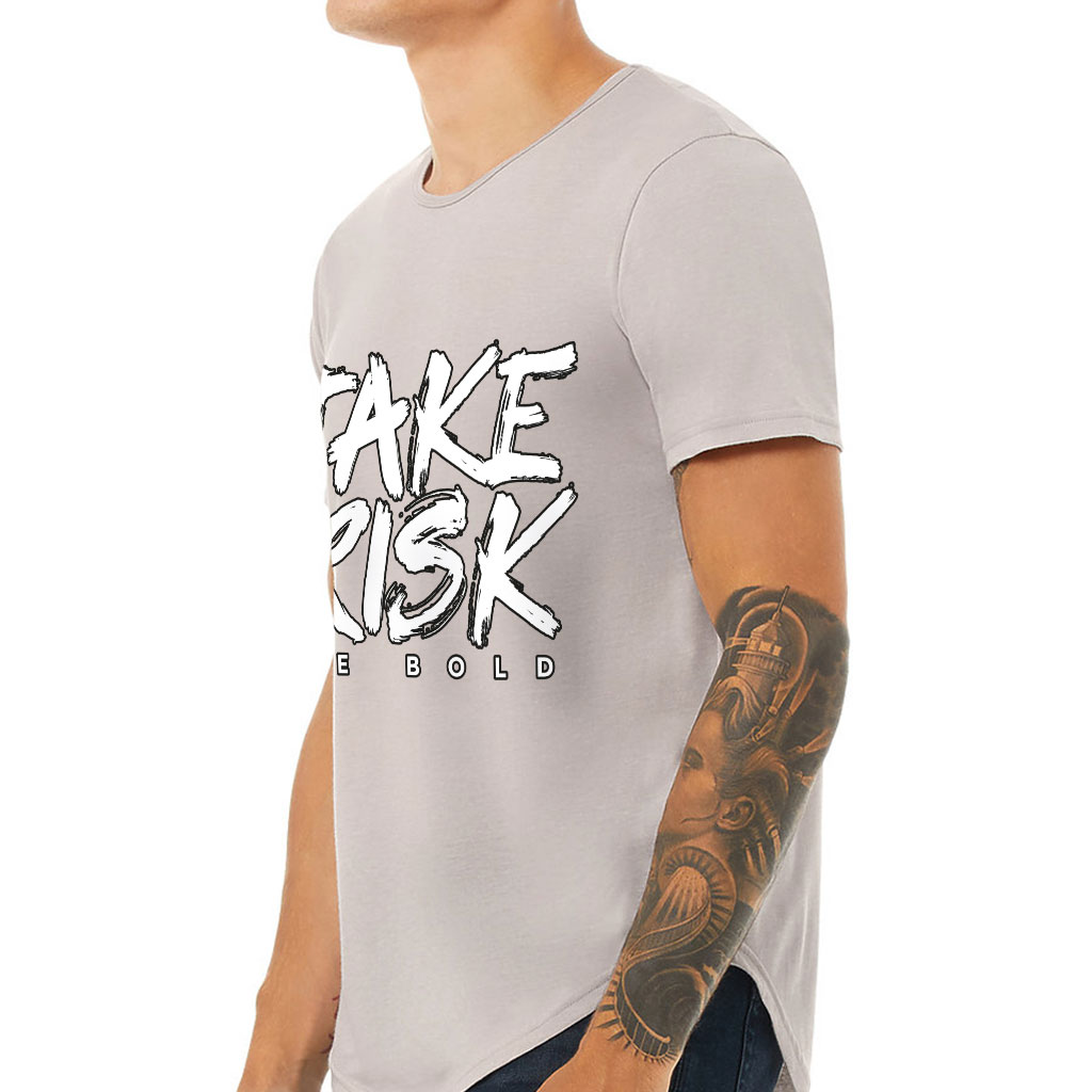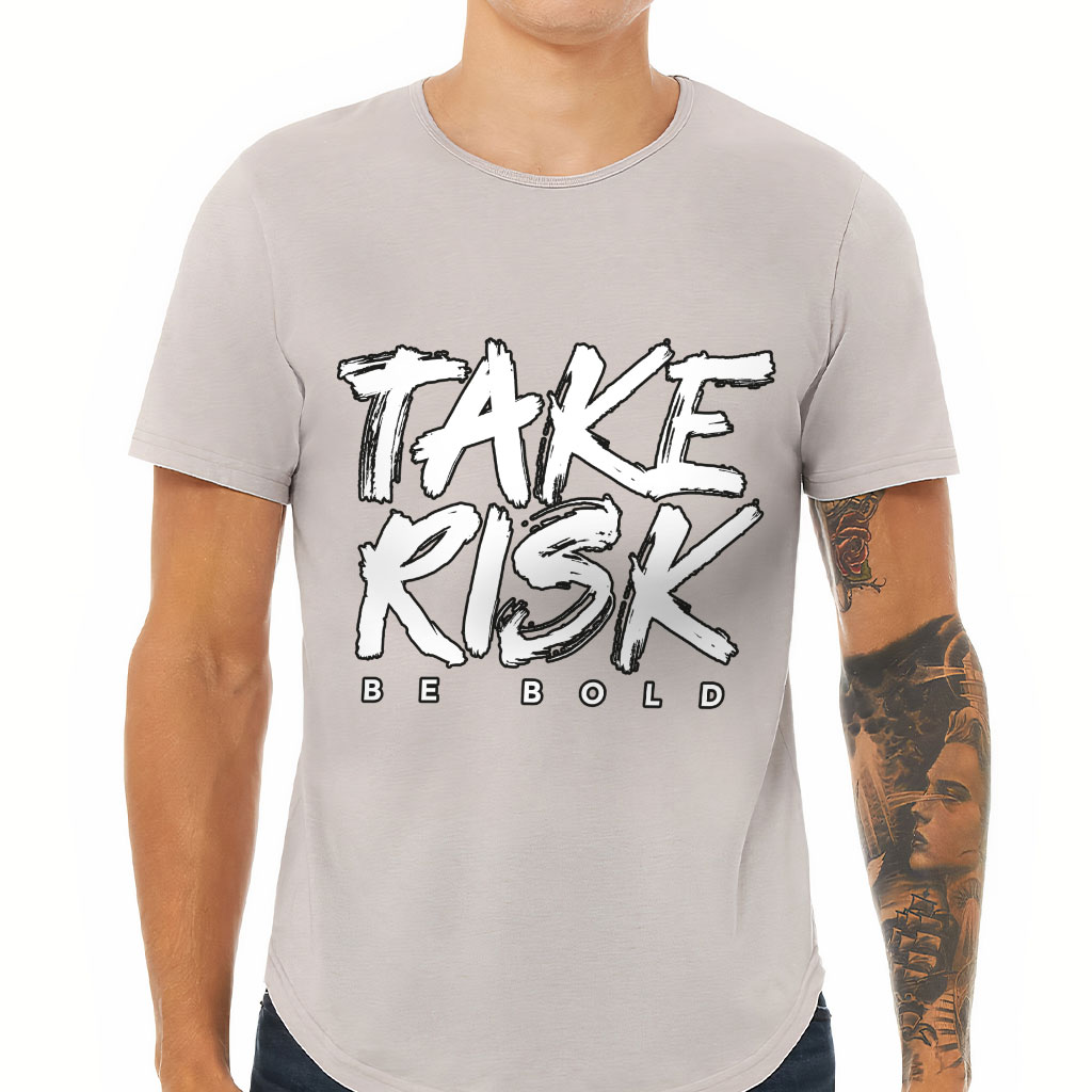 Take Risk Curved Hem T-Shirt is no ordinary piece of clothing. Its 3/8 neck binding, subtle