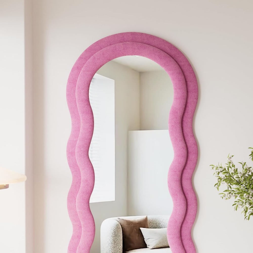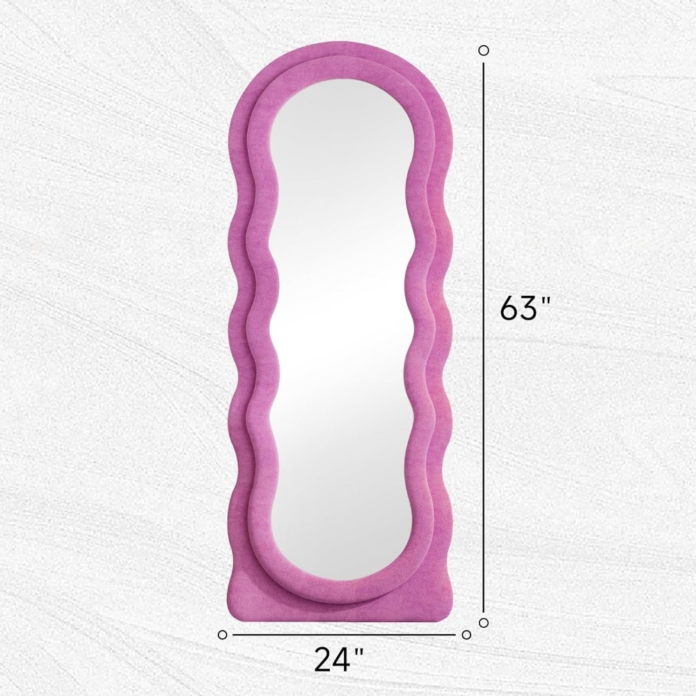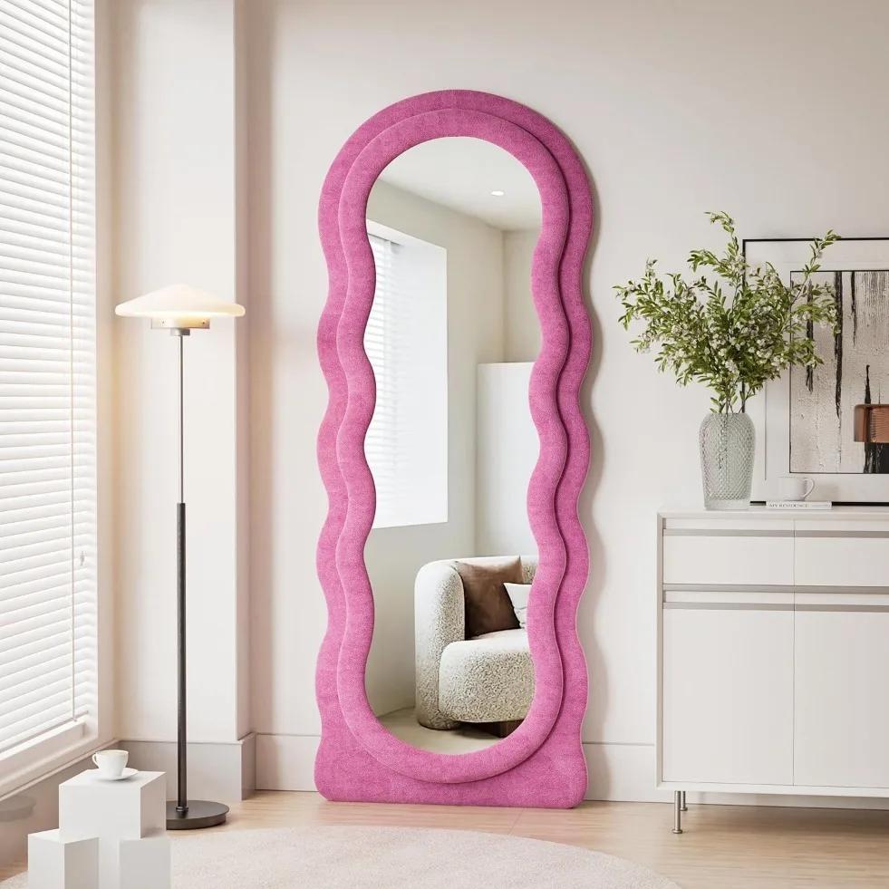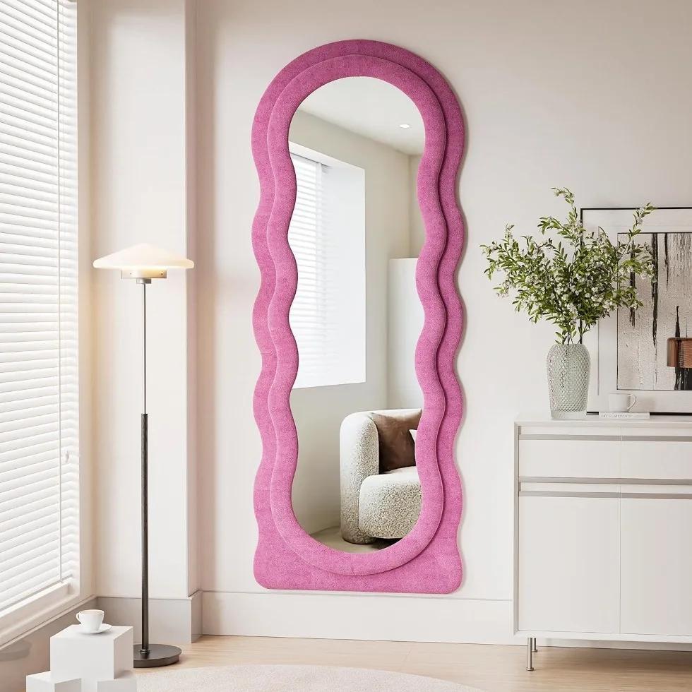 Transform your home with this eye-catching, irregular wave-shaped full-length mirror that adds a touch of modern sophistication to any room. The 63″ x 24″ mirror is not just functional but a statement piece that enhances the beauty of your space. With its stylish pink flannel-wrapped wooden frame, this mirror is perfect for adding a pop of color and texture to your dressing room, hallway, or living room.